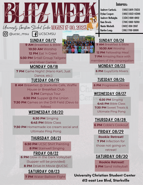 Whether you are a new student this Fall or returning, we would love to get to know you and invite you to be a part of the University Christian Student Center during our Bulldog Blitz events August 17-30th: